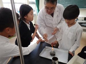 今日は、「アルコールランプを使って熱してみよう」の実験です。物の温まり方の事前学習です。まずは、マッチでアルコールランプに火をつけます。最近ではマッチを使うことはほとんどなくなってきました。子どもたちは怖がらずに、上手にマッチをすっていました。その後、次に行う実験の器具を確認して準備をしました。次の時間は、水を温めていきます。どのように温まっていくのか楽しみです。