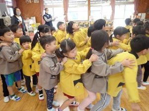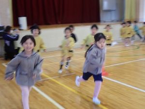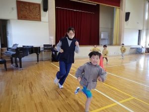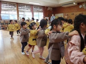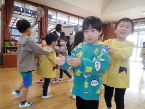 今日は八上幼幼稚園にやってきました。八上幼稚園にはたくさんのお友達がいました。たくさんのお友達と一緒に貨物列車をしました。いつもより長い列車になって大喜びの園児たちでした。その後小学校の講堂で体をいっぱい使ってみんなで遊んで、一緒に給食を食べました。