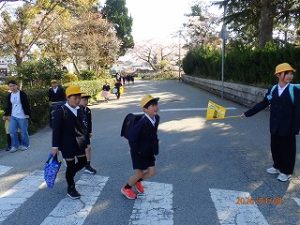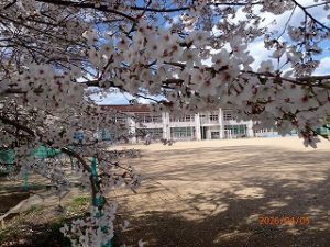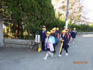 令和8年度のスタートです。校庭の桜は満開で少し散り始めています。子供たちは新しい年度を迎えるにあたって、また久しぶりに出会った友達の顔を見てとてもうれしそうに登校してきました。新6年生を中心として、高学年が各町の子供たちを先導して連れてきています。今までから交通委員をしていた子供たちもいましたが、気持ちを新たにして、しっかりと自分たちの町の子たちが並んでいる様子を見ながら登校している様子が伺えました。