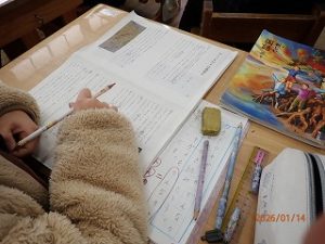 書き初めをしました。「春を待つ」を書きました。バランスよく書くのが難しいです。一文字一文字はうまく書けていました。なかなか納得いかないようで何度も書いている子もいました。集中してよい時間が過ごせました。