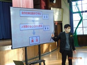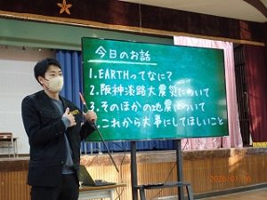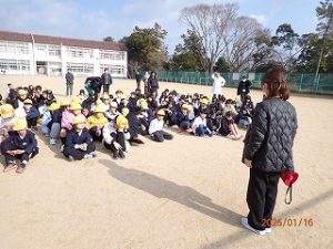 1月16日全校朝会でメモリアル集会を行いました。まずは亡くなった方への黙祷を行いました。次に、アース員(兵庫県学校支援チーム)である本校職員から、震災の話を聞きました。話の中で、自分が生まれて数日後に震災があったこと。家にすぐに帰ってきて家族からかけられた言葉は「おめでとう」ではなく「生きててよかった」なそ自身の体験についても話を聞きました。児童たちは真剣に話を聞いていました。また、休み時間に地震による避難訓練を実施しました。どんな時にでも安全に避難できるように取り組みました。いろいろな場所に児童がいましたが、自分で身を守る方法を考え行動することができました。
