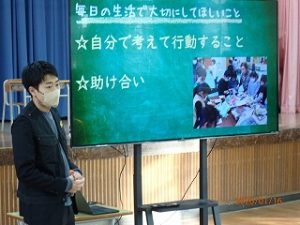 まず、二学期の始業式で話をした「何をがんばる 何を続ける」と子どもたちになげかけていたことについて問いかけました。なんだったかなあと考えている子、がんばったよねって顔をしている子など反応は様々でした。子どもたちと各学年の友だちや地域の方などのいろいろなつながりや笑顔あふれる写真アルバムを見ました。とっても良い顔で振り返りました。その後、表彰を行いました。3学期みなさんの元気な顔を見られるのを楽しみにしています。