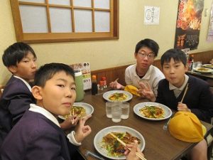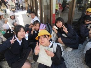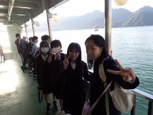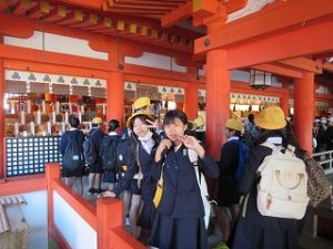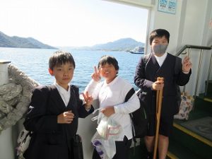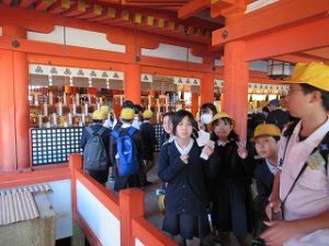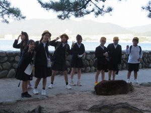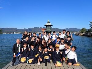 修学旅行2日目です。今日は朝早く起きて宮島に向かって出発です。みんな元気です。今日も雲1つない天候に恵まれました。まずはフェリーに乗って宮島に向かいます。宮島に着くと鹿が出迎えてくれました。篠山でもよく見るしかですが宮島のシカは格別のようです。その後いよいよ宮島を見学です。厳島神社は、海の中に浮かぶ鳥居の姿に大喜びな子どもたちでした。本殿を参拝し、みんなが元気に過ごせるようにとお祈りをしました。次は楽しみにしていたお土産です。子どもたちはあれこれと思いを巡らせながらお土産の買い物を楽しみました。最後は、なんといっても広島焼きです。お店の人に広島焼きですね。というと少し苦笑い。広島ではお好み焼きでした。ごめんなさい。大きなお好み焼きでしたが、子どもたちはペロリと食べきることができ、とっても満足でした。みんな元気に修学旅行を満喫することができました。