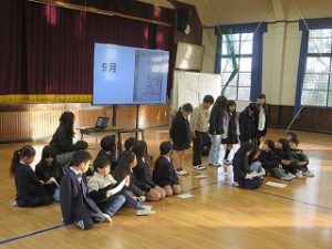 今日は2年生が人権プランについて発表しました。「挨拶大作戦」ということで大きい声で挨拶することを目標に取り組んできました。挨拶チャレンジをして自分で挨拶ができるようになったことをみんなの前で発表しました。大声で挨拶することがとても気も意よくみんなが笑顔になれることがわかったと発表しました。「笑顔になるあいさつ」の見本を見せてくれました。感想では各学年から「大きな声で挨拶をすると、1日が気持ちよく過ごせることがわかりました。」「2年生が大きな声で挨拶をしてたのはこの取り組みのせいかだとわかりました。」などと発表があり、とても満足そうな2年生でした。