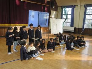 1月16日全校朝会でメモリアル集会を行いました。まずは亡くなった方への黙祷を行いました。次に、アース員(兵庫県学校支援チーム)である本校職員から、震災の話を聞きました。話の中で、自分が生まれて数日後に震災があったこと。家にすぐに帰ってきて家族からかけられた言葉は「おめでとう」ではなく「生きててよかった」なそ自身の体験についても話を聞きました。児童たちは真剣に話を聞いていました。また、休み時間に地震による避難訓練を実施しました。どんな時にでも安全に避難できるように取り組みました。いろいろな場所に児童がいましたが、自分で身を守る方法を考え行動することができました。