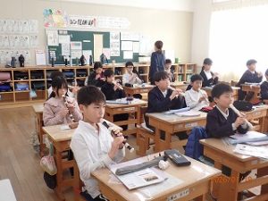 4年生は音楽の時間リコーダーを練習しています。4年生は、とても良い音で吹いていました。少し低い音になると指でうまく穴がふさがれていないと思った音が出せません。低い音ほど難しくなるのですがとっても上手でした。息の入れ方もよく本当に素晴らしい演奏ができていました。